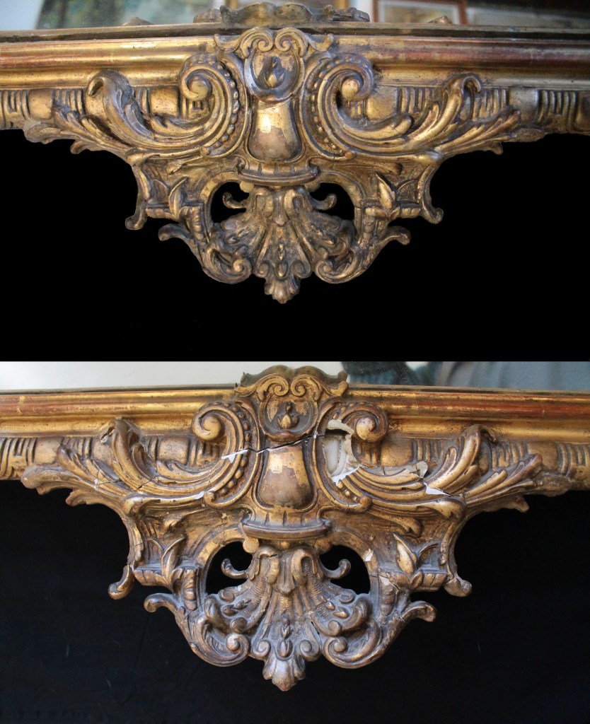 Restauration des zones fragilisées d’un cadre Louis XIV (ci-dessus) et reprise d’une ancienne restauration dont les moulures réintégrées étaient trop épaisses (photo précédente).