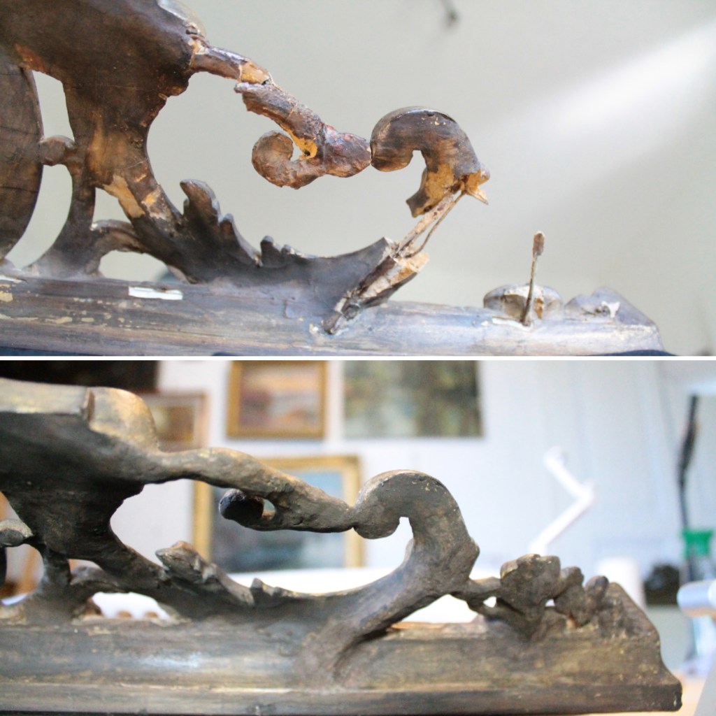 Suite à une chute, les moulures de l’angle inférieur droit de ce cadre se sont cassées. Les éclats ont été recollés et les manques resculptés, enfin, une patine a été appliquée pour unifier le tout.