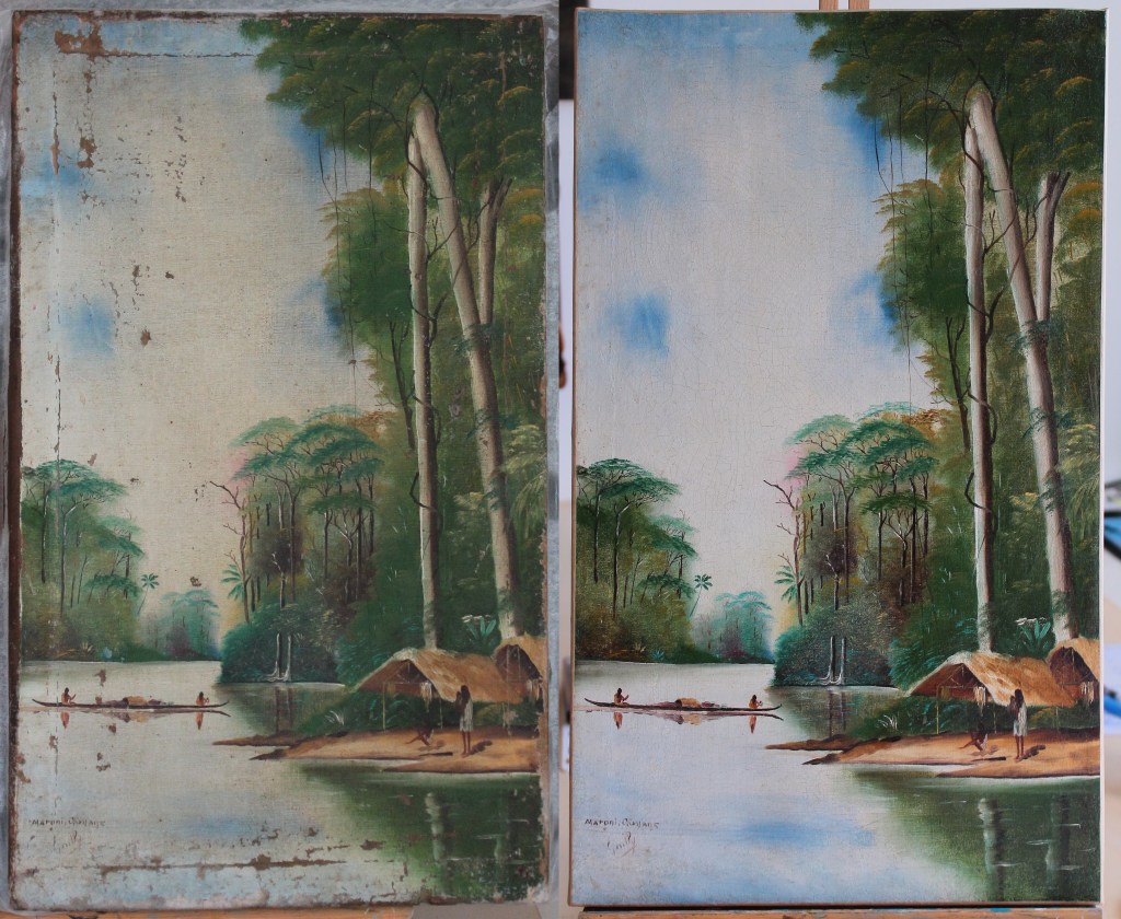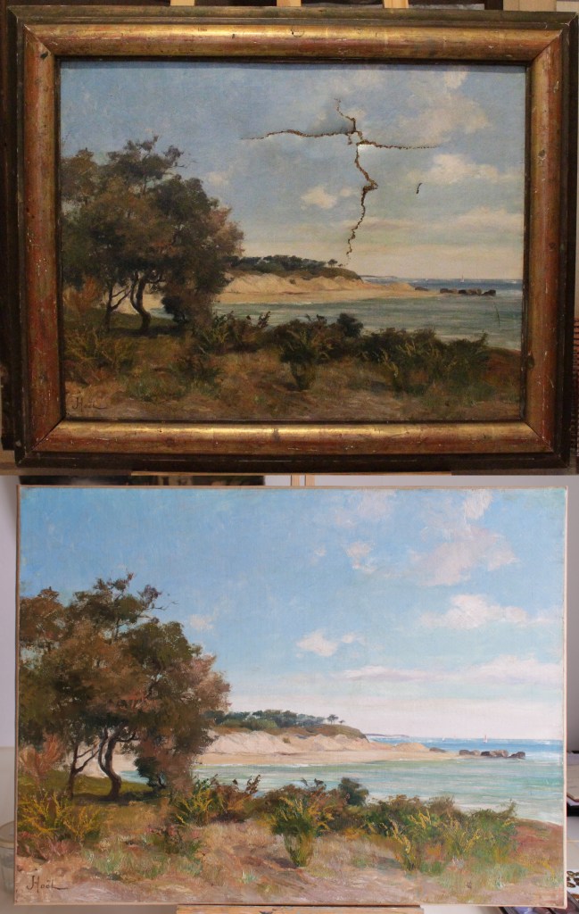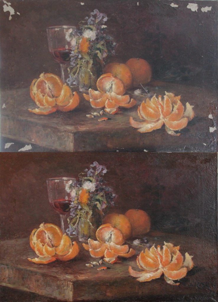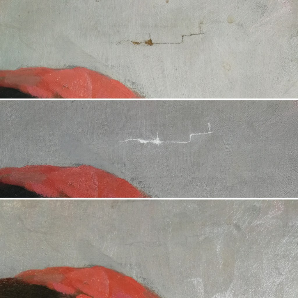 Reprise d’une déchirure et allègement de vernis sur ce petit tableau d’une Vénus à la colombe.