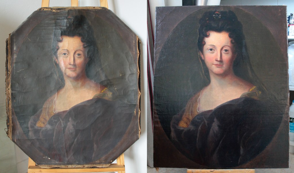 Restauration du portrait présumé de Mme de Montmaur. Ce portrait de format rectangulaire était fixé par dessus un portrait d’homme au format octogonal.